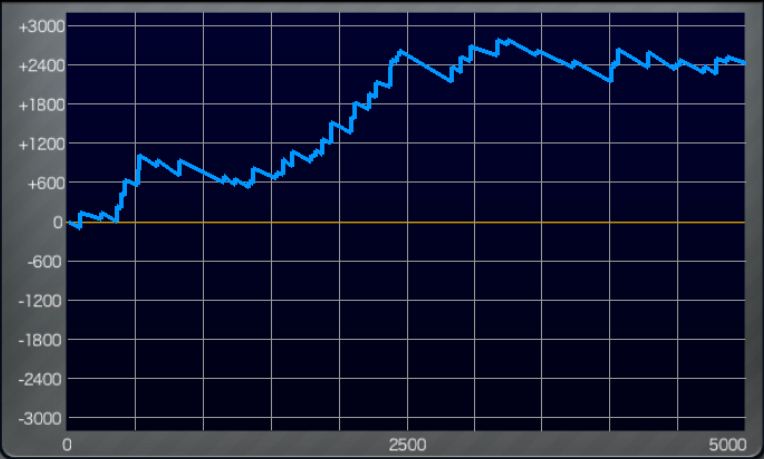 マイジャグラーで最高レベルで出ているときは、何をやってもペカペカ光りますよね。そういう時での、各設定、回転数で最高の差枚数をサンプルから確認します。至福タイムでのデータです。サンプル値はピーク値ではなく、各回転時での最大差枚です。また、今回は良く出た台のその後を追跡します。